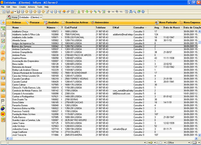 Entidades – na qual dispõe de toda a informação sobre clientes, ocorrências, companhias e angariadores;